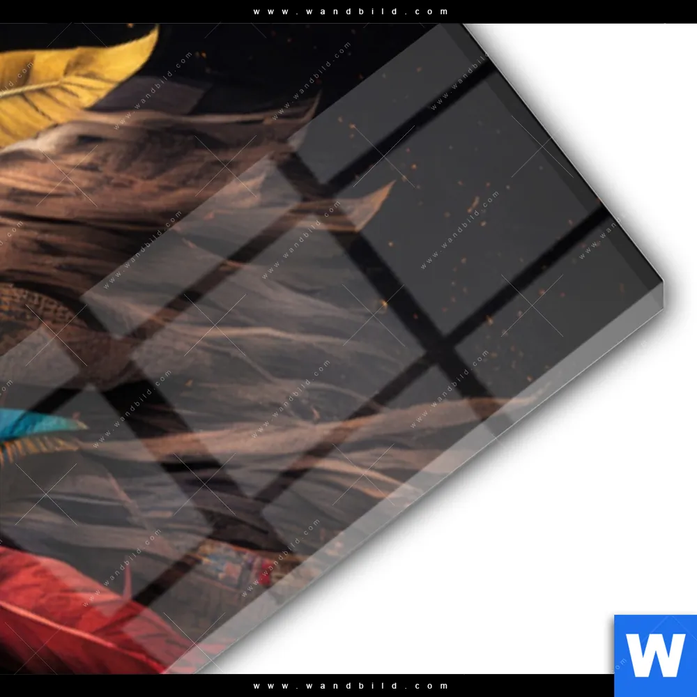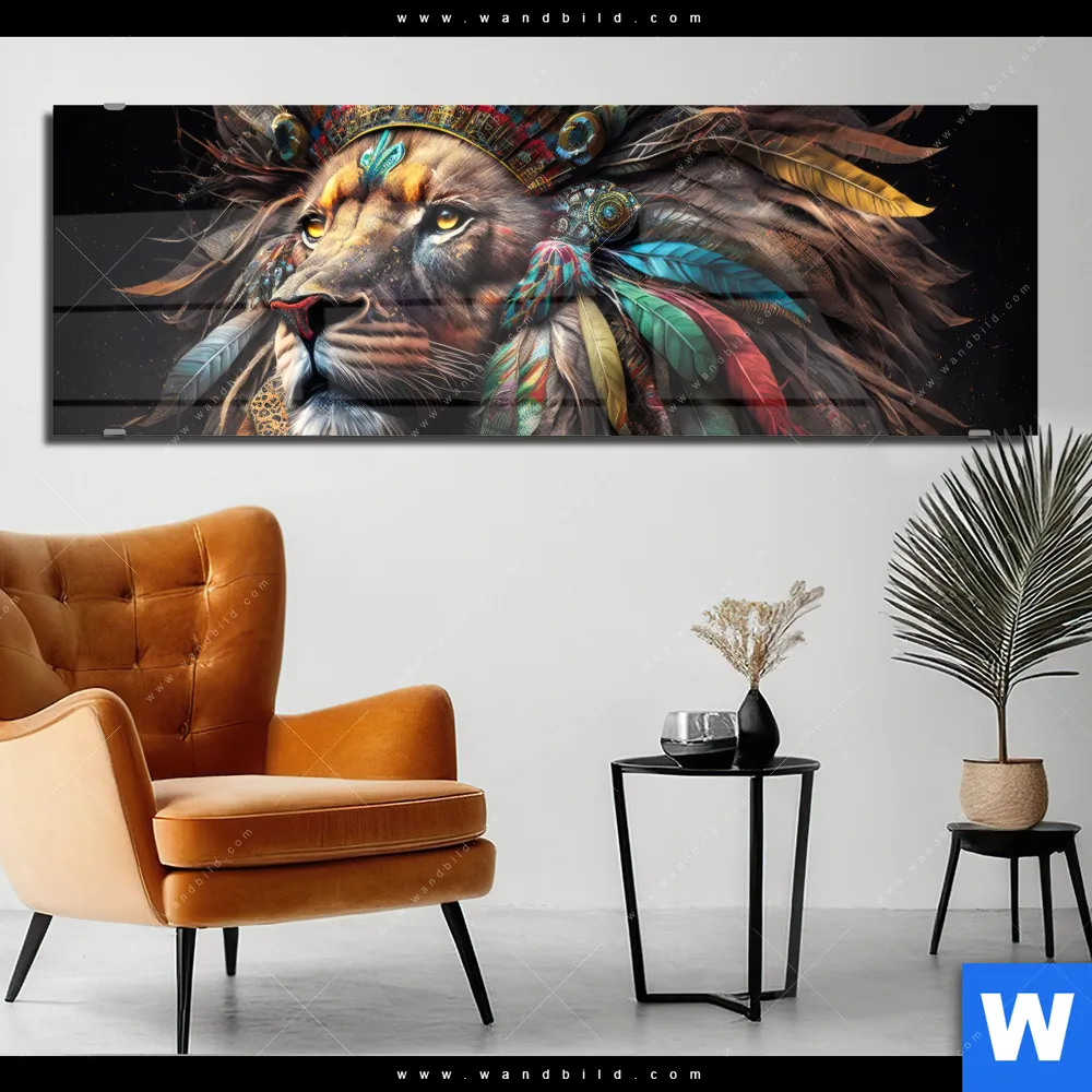 Acrylglasbild | Löwenkopf mit bunten Federn | Panorama