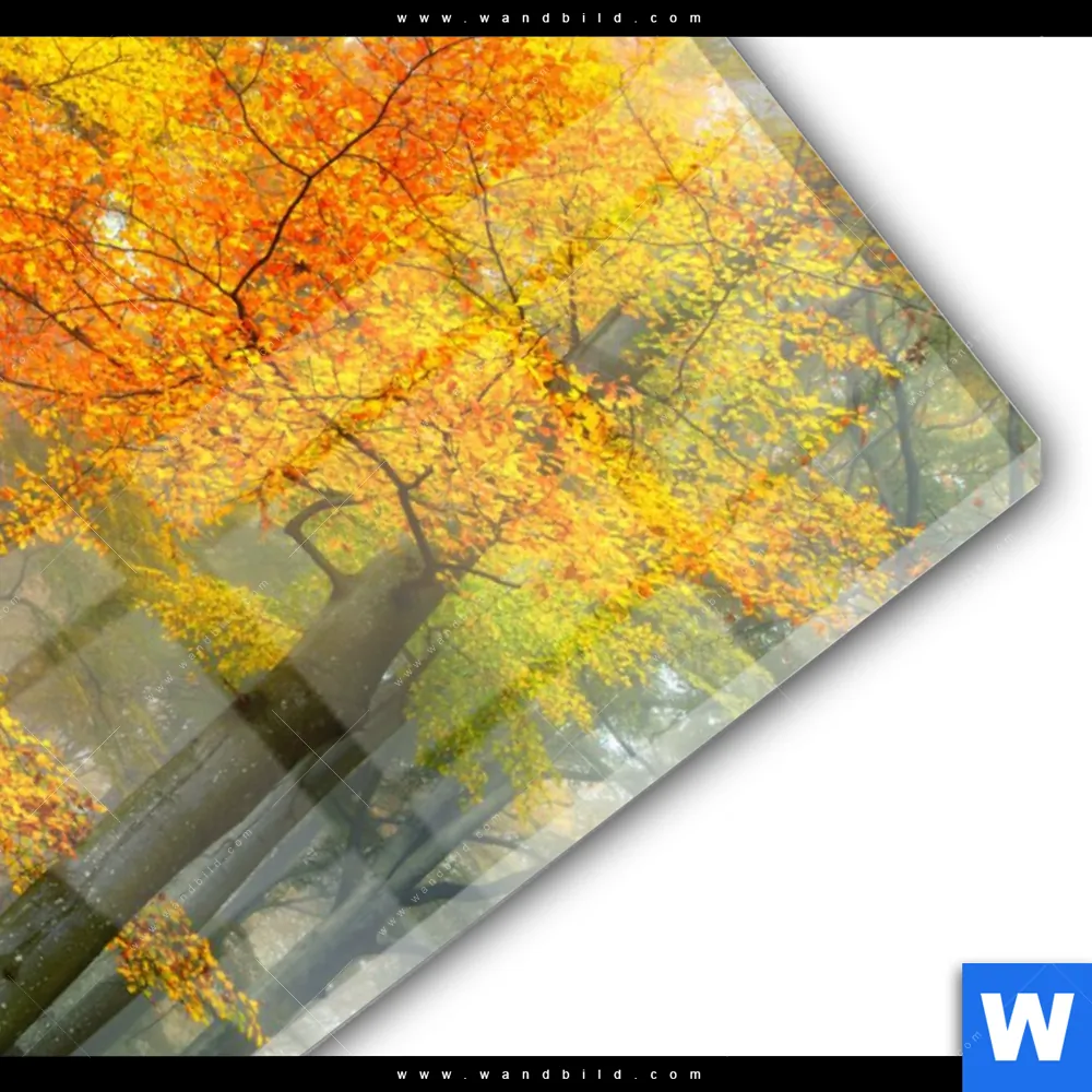 Acrylglasbild | Herbstfarben im nebligen Wald | Hochformat