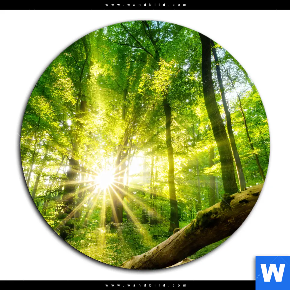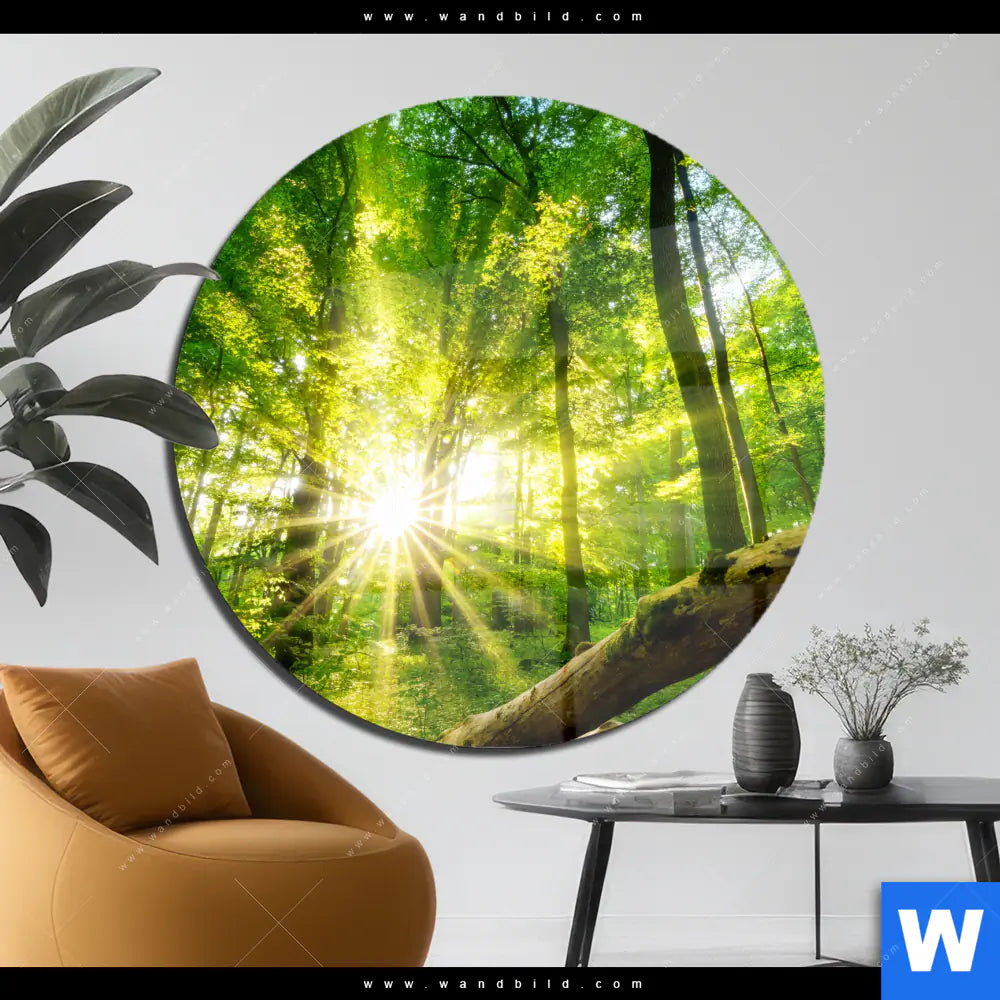 Acrylglasbild | Sonnenstrahlen im dichten Wald | Rund