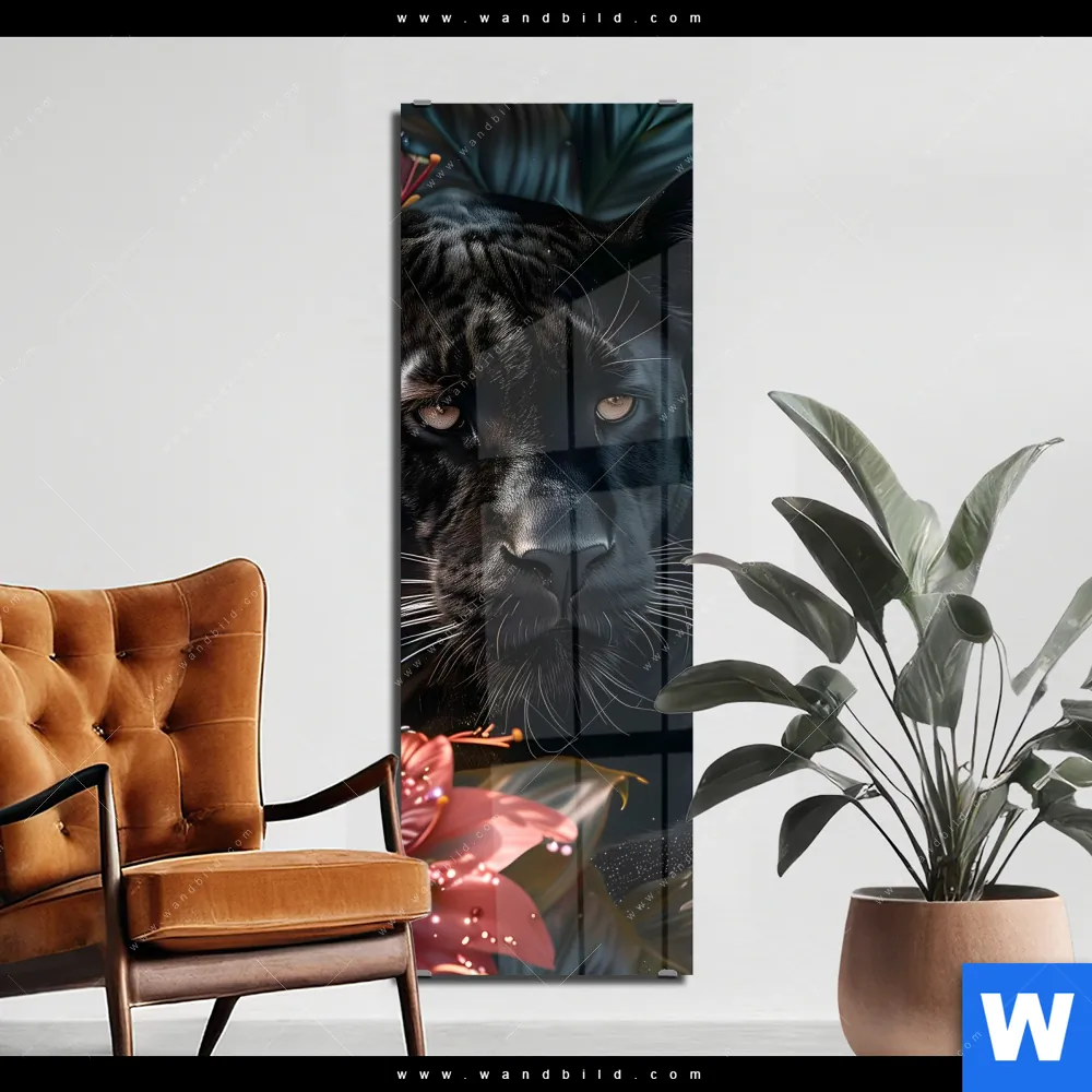 Acrylglasbild | Panther und rote Blüten | Schmal
