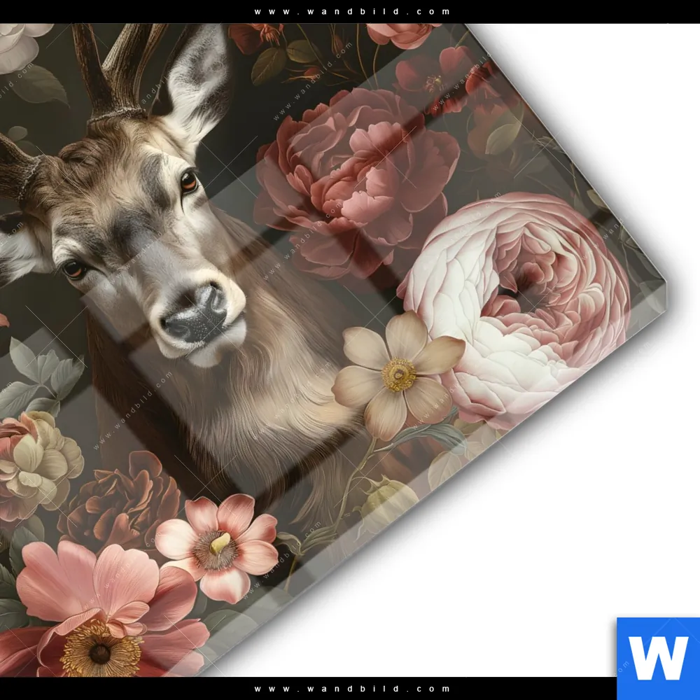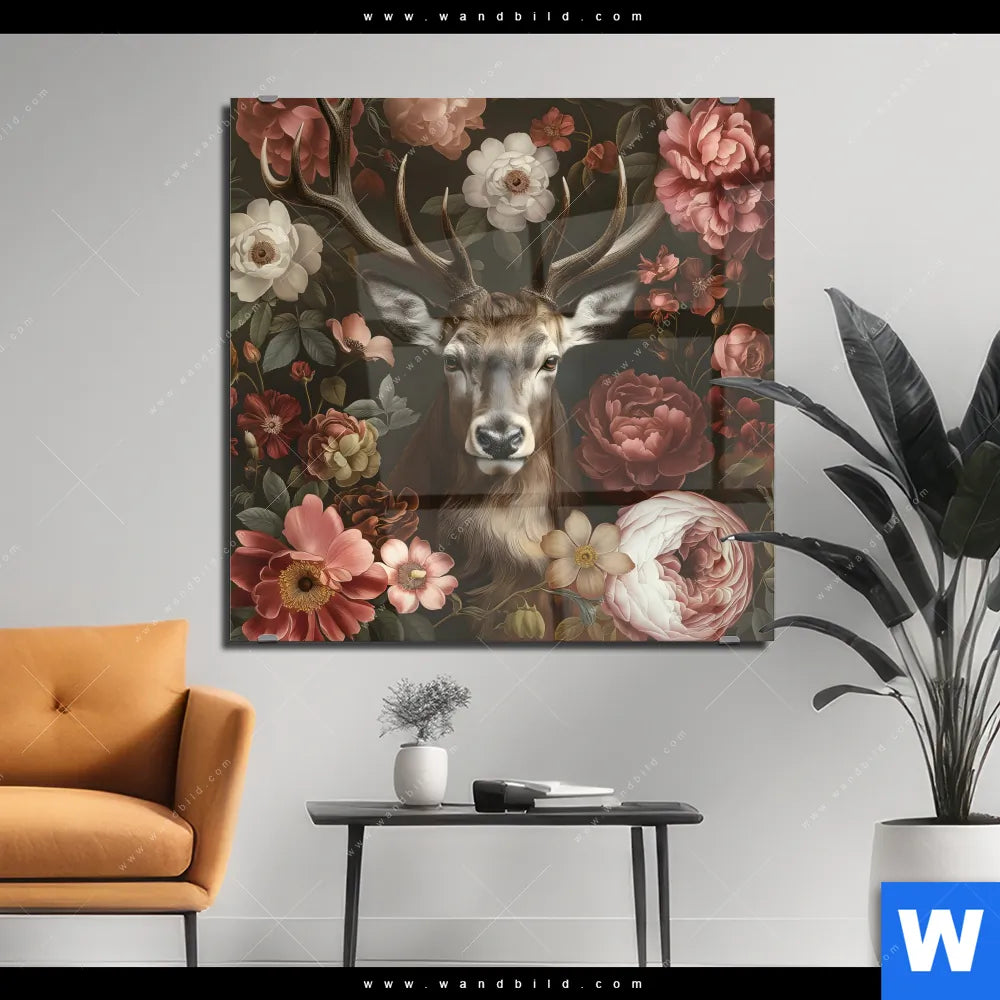 Acrylglasbild | Friedlicher Hirsch und Blüten | Quadrat