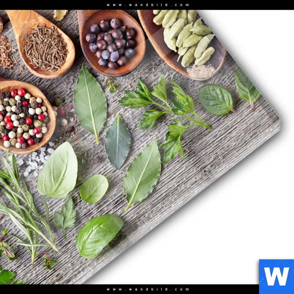 Acrylglasbild | Gewürze auf Holzlöffeln | Quadrat