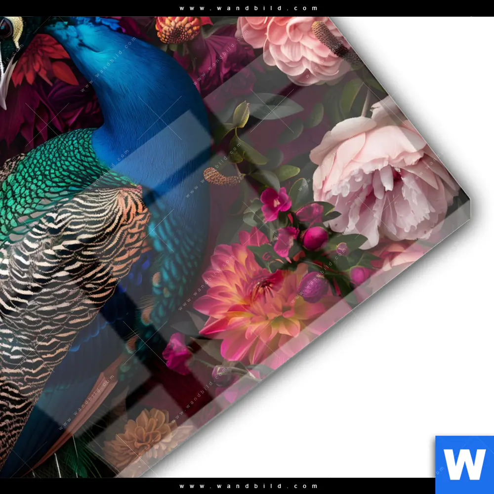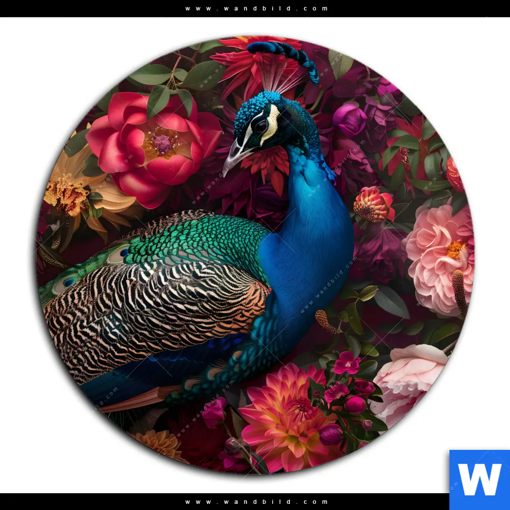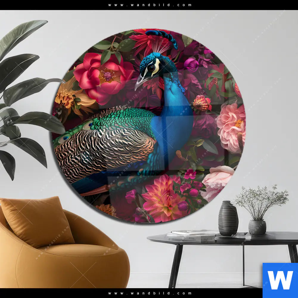 Acrylglasbild | Prachtvoller Pfau und Blüten | Rund