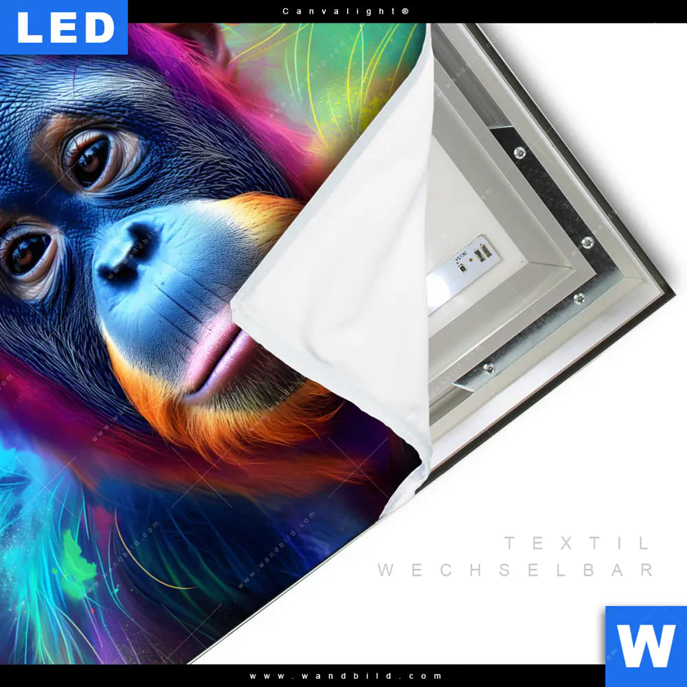 Canvalight® TEX Leuchtbild | Orang-Utan in Regenbogenfarben | Quadrat