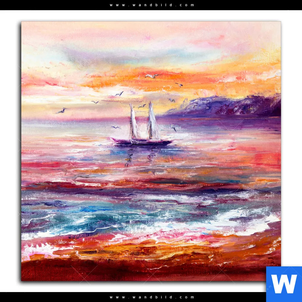 Alu-Dibond Bild | Gemälde mit Boot im Sonnenuntergang | Quadrat