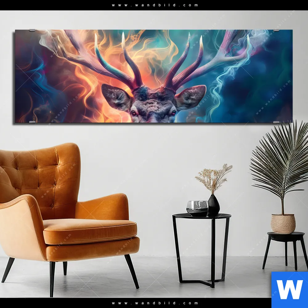 Alu-Dibond Bild | Bunter Hirsch in Flammen | Panorama