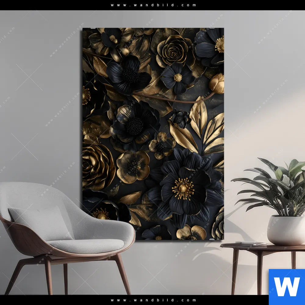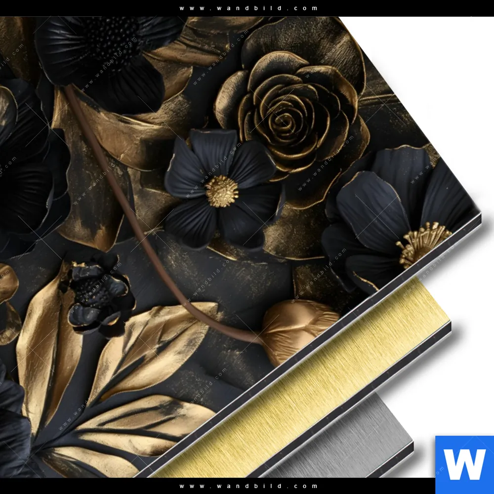 Alu-Dibond Bild | Schwarze und goldene Blüten | Hochformat