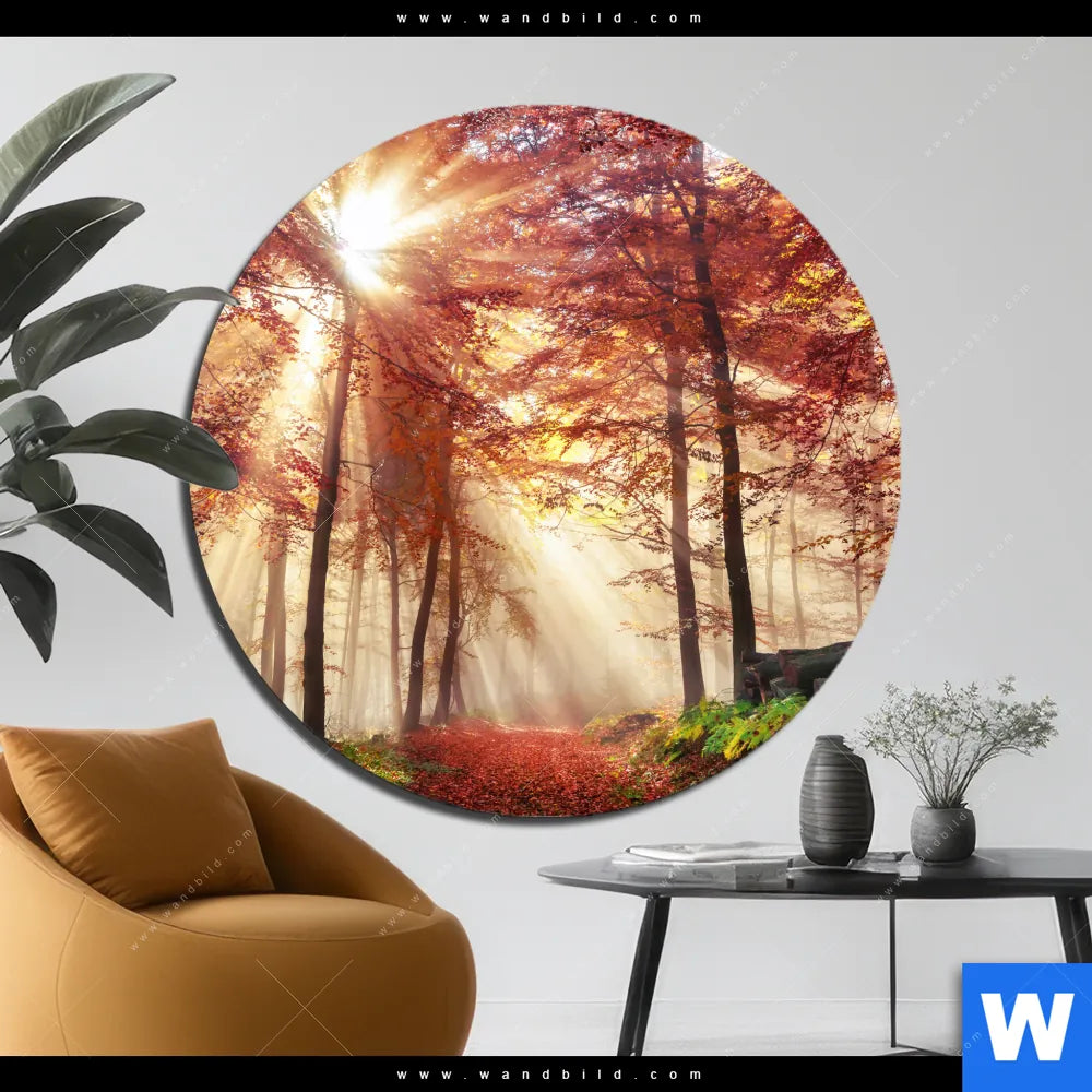 Alu-Dibond Bild | Sonnenlicht im nebligen Wald | Rund