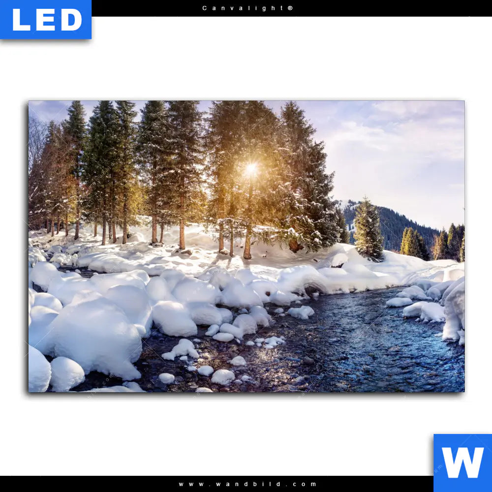Canvalight® Leuchtbild | Schneebedeckte Landschaft am Fluss | Querformat