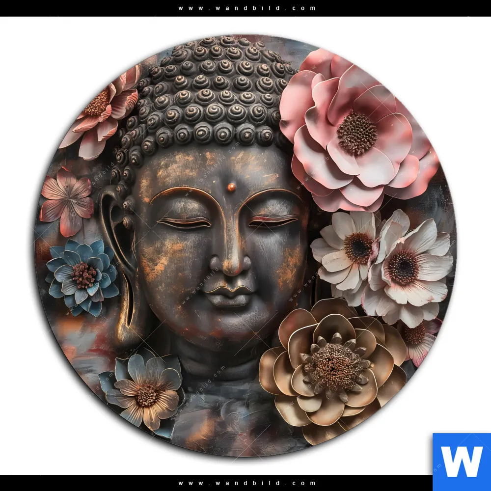 Aluminiumbild gebürstet | Spiritueller Buddha und Blumen | Rund