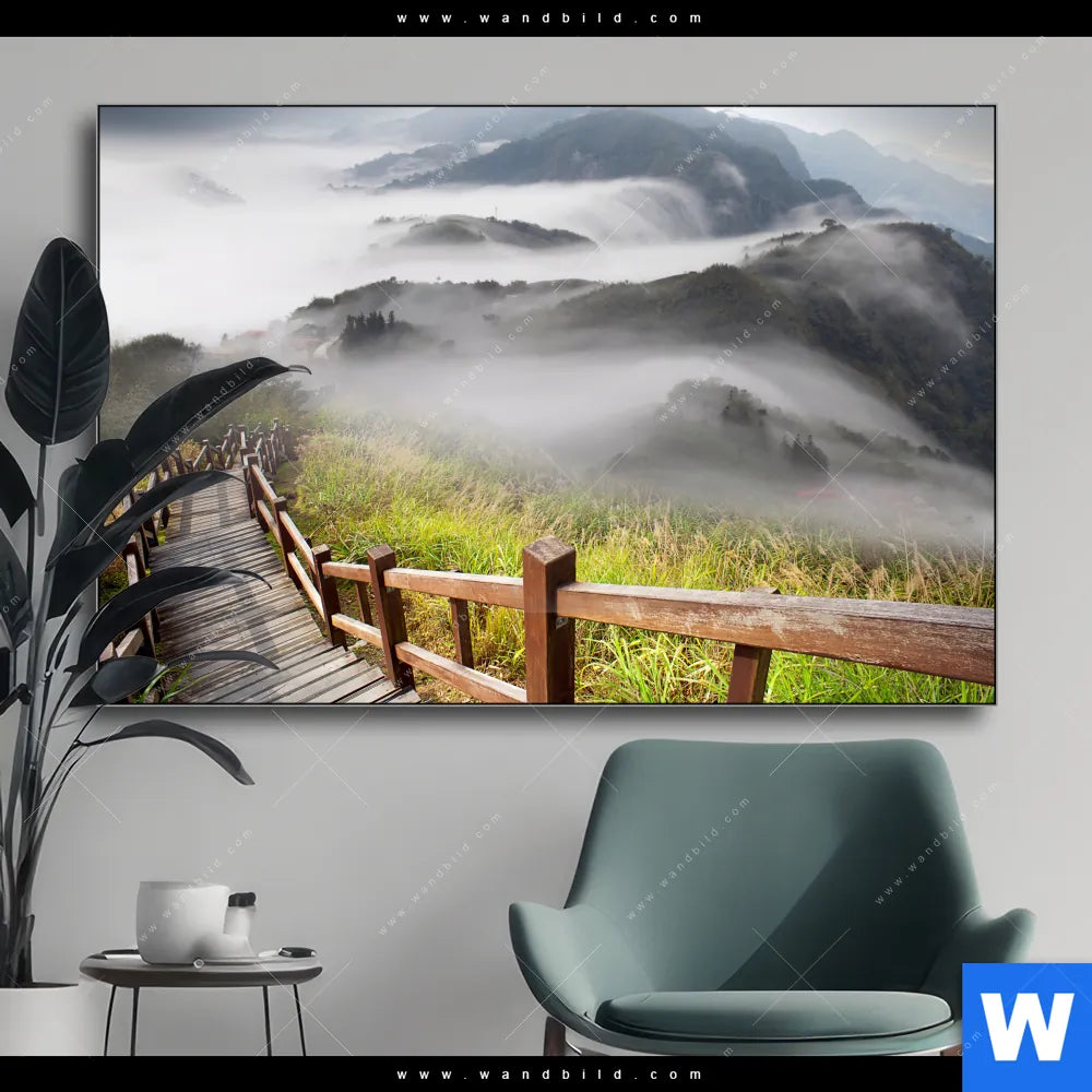 Wechselmotiv | Holztreppe auf Berg mit Wolken | Querformat