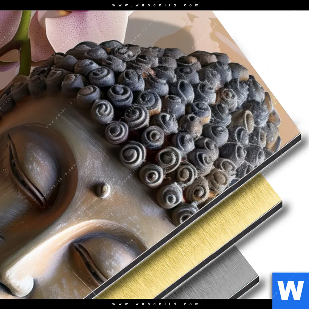 Buddha - Feng Shui, Blumen - Botanik Aluminiumbild mit metallischem Effekt inkl. vormontiertem Rückrahmen