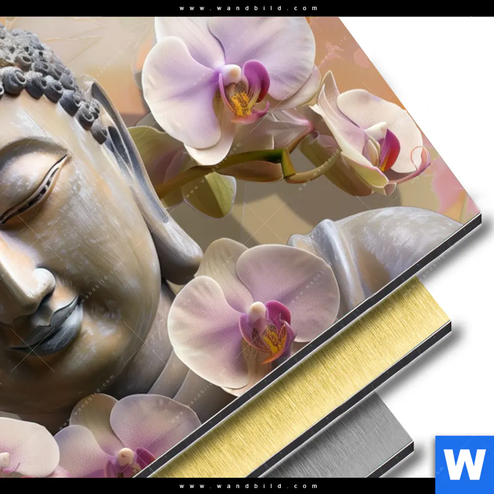 Aluminiumbild gebürstet | Buddha & Orchideen | Querformat