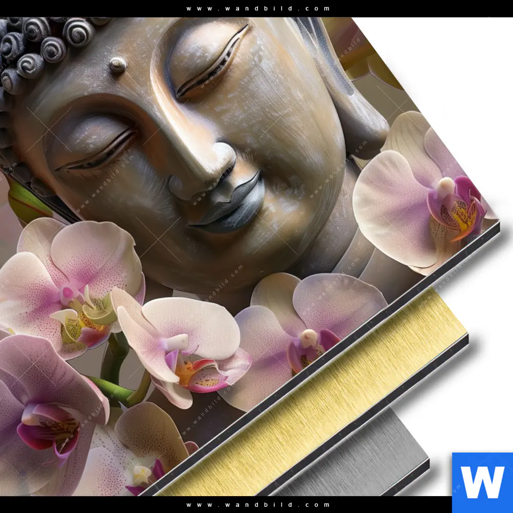 Buddha - Feng Shui, Blumen - Botanik Aluminiumbild mit metallischem Effekt inkl. vormontiertem Rückrahmen