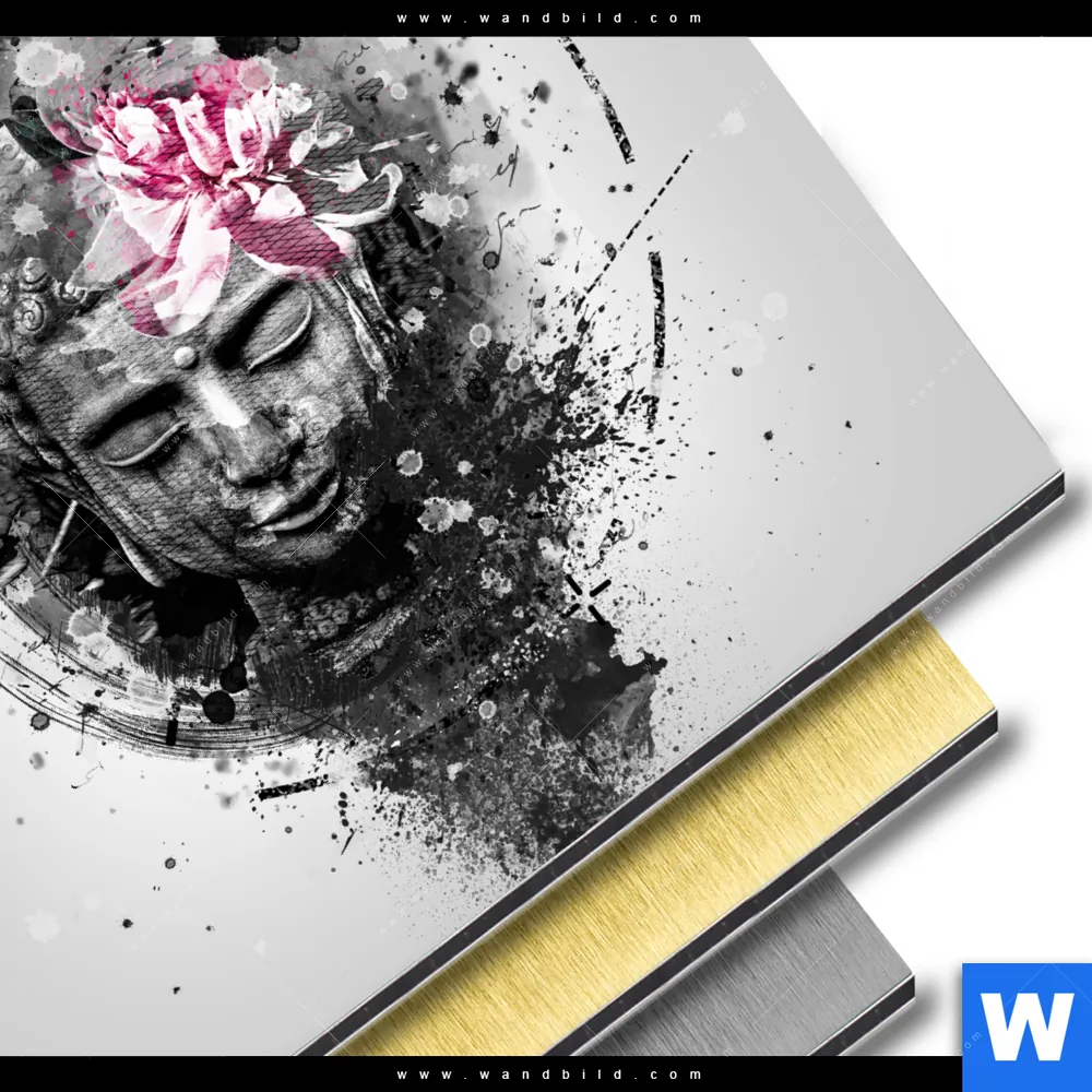 Buddha - Feng Shui, Blumen - Botanik Aluminiumbild mit metallischem Effekt inkl. vormontiertem Rückrahmen