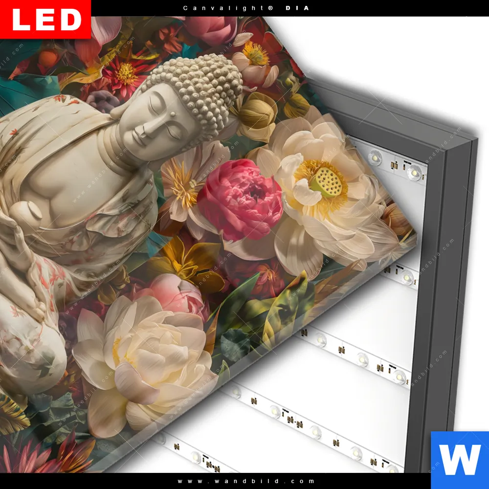 Wechselmotiv Acrylglas Canvalight® DIA | Buddha in farbenfrohen Blumen | Quadrat