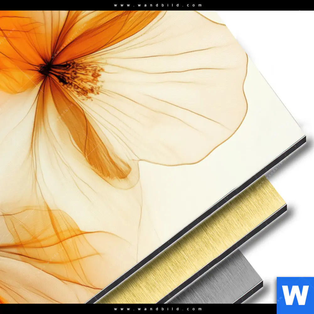 Aluminiumbild gebürstet | Zarte Blüten in Orange | Hochformat
