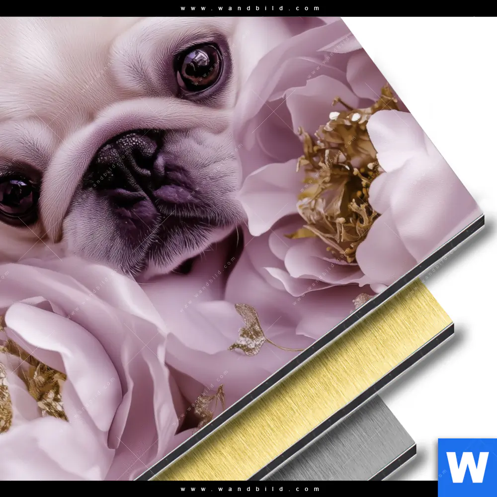 Aluminiumbild gebürstet | Mops im Blütenmeer | Quadrat