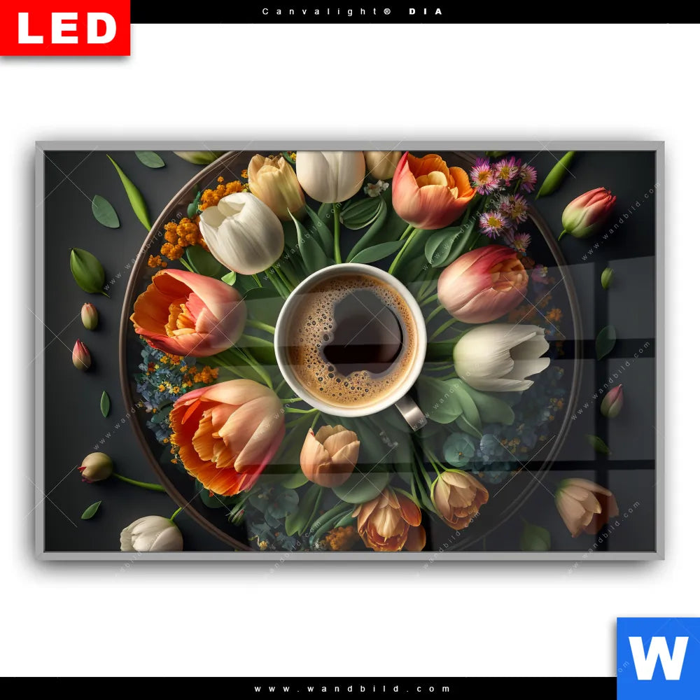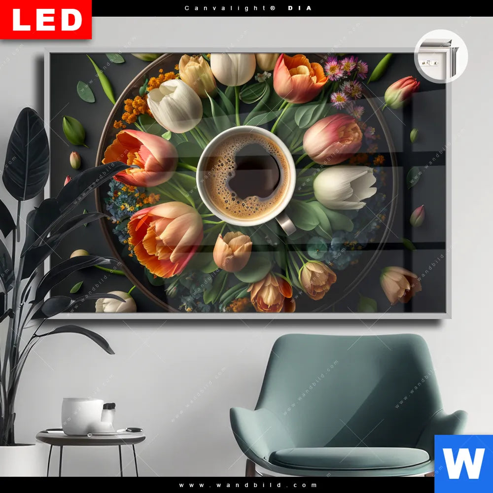 Canvalight® DIA Leuchtbild | Kaffee inmitten wunderschöner Blumen | Querformat