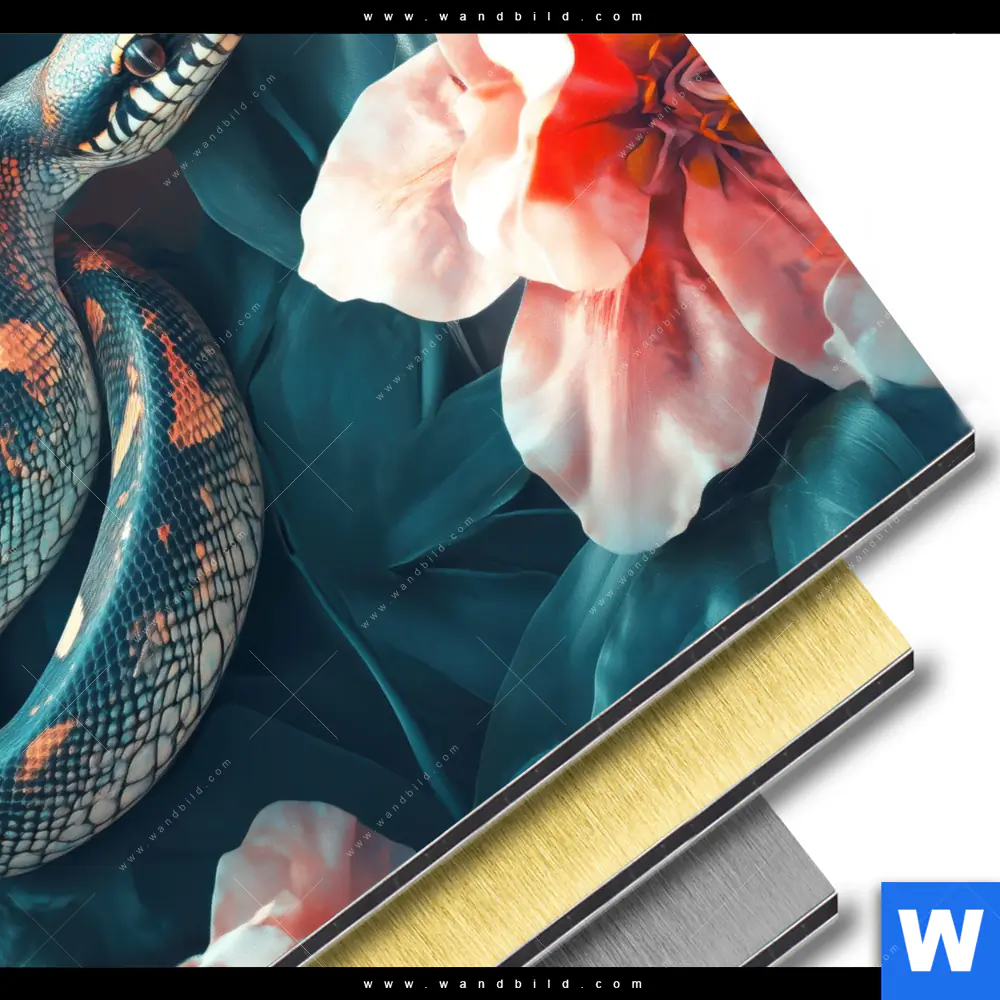 Aluminiumbild gebürstet | Schlange zwischen großen Blüten | Rund