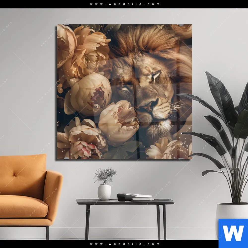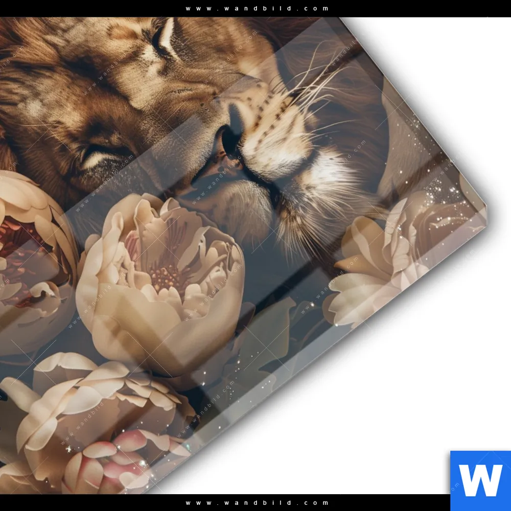 Acrylglasbild | Löwe schläft in Blüten | Quadrat