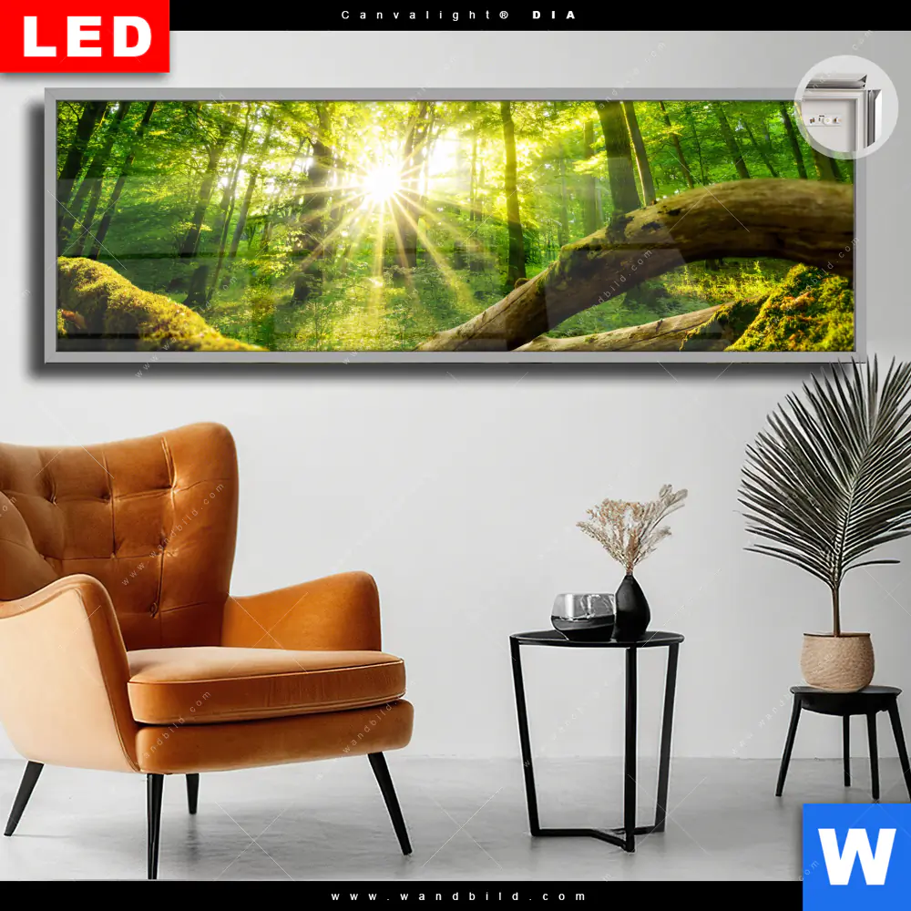 Canvalight® DIA Leuchtbild | Sonnenstrahlen im dichten Wald | Panorama