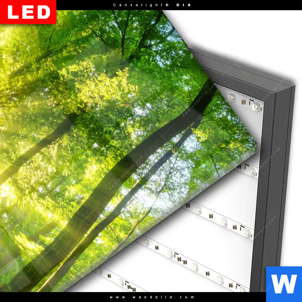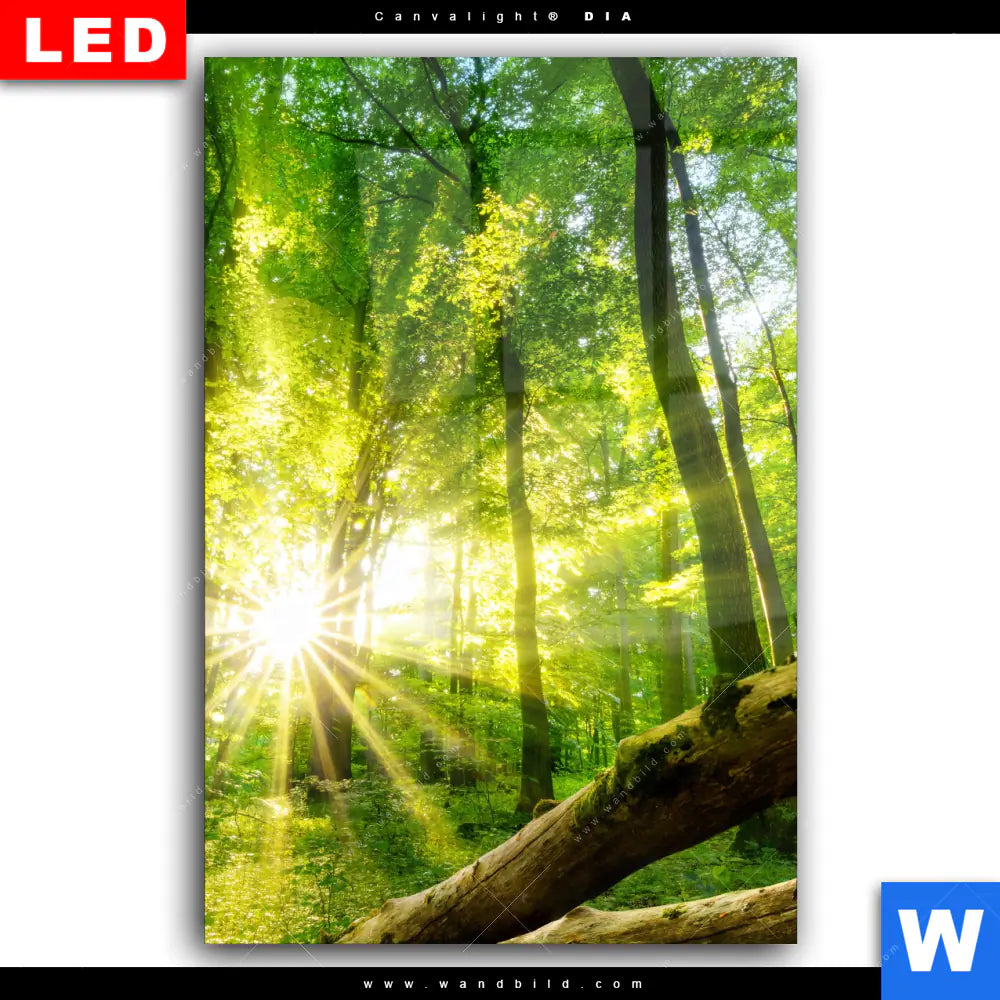 Wechselmotiv Acrylglas Canvalight® DIA | Sonnenstrahlen im dichten Wald | Hochformat
