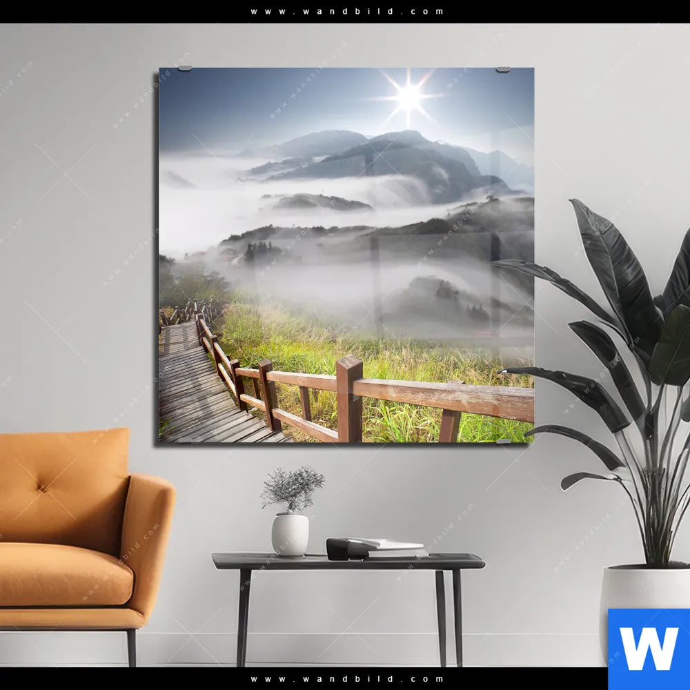 Acrylglasbild | Holztreppe auf Berg mit Wolken | Quadrat