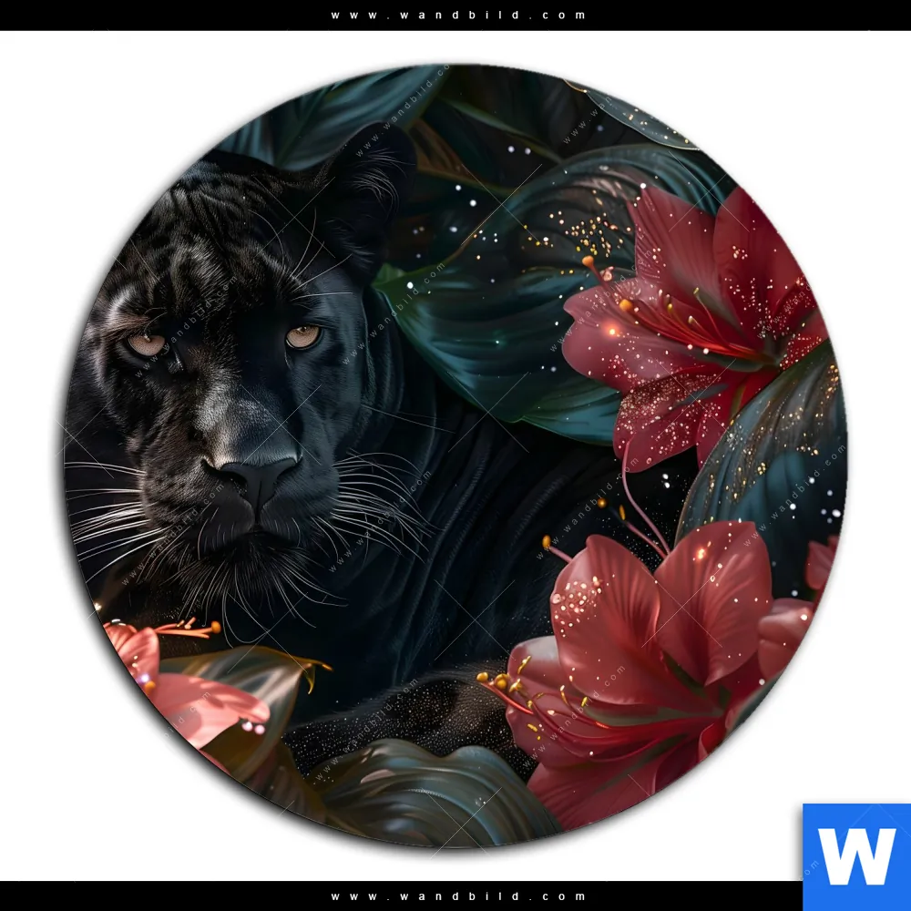 Alu-Dibond Bild | Panther und rote Blüten | Rund