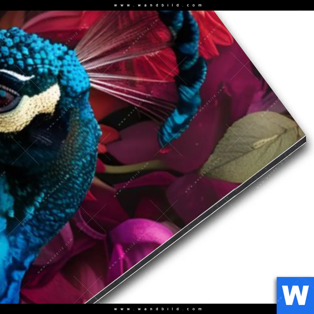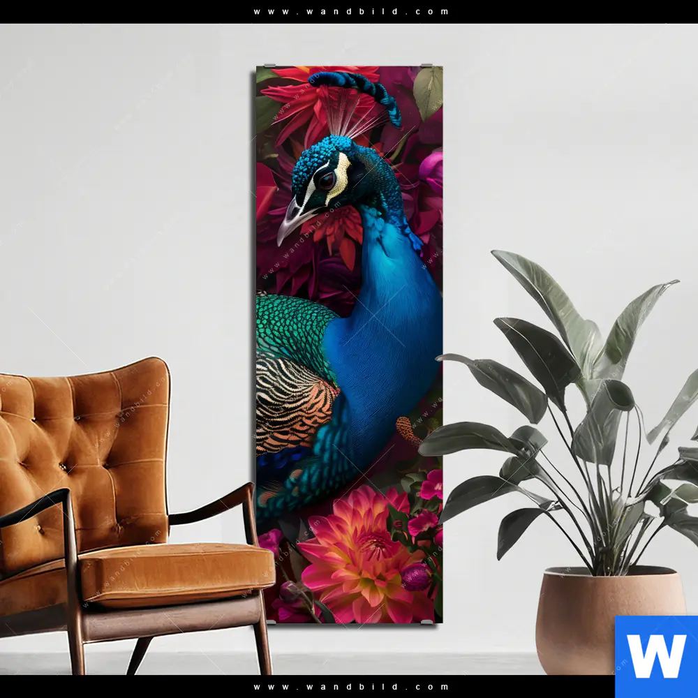 Alu-Dibond Bild | Prachtvoller Pfau und Blüten | Schmal