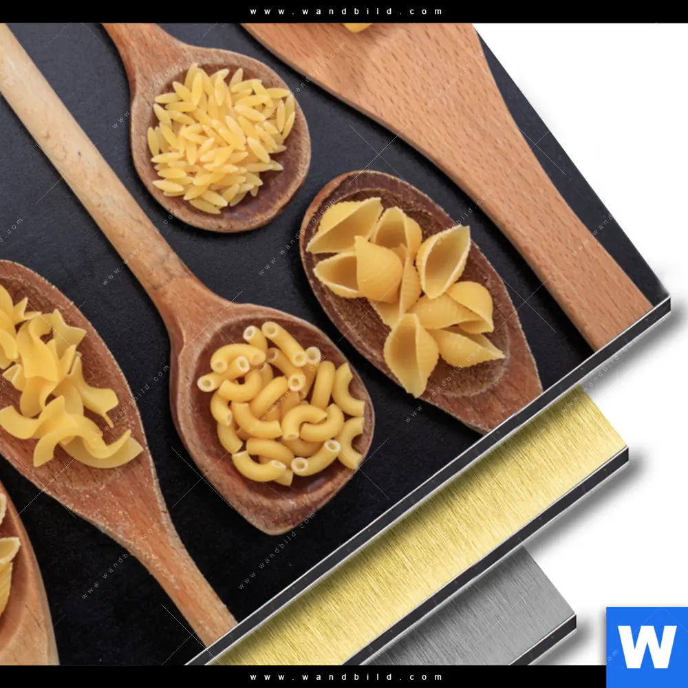 Aluminiumbild gebürstet | Pasta auf Löffeln | Hochformat