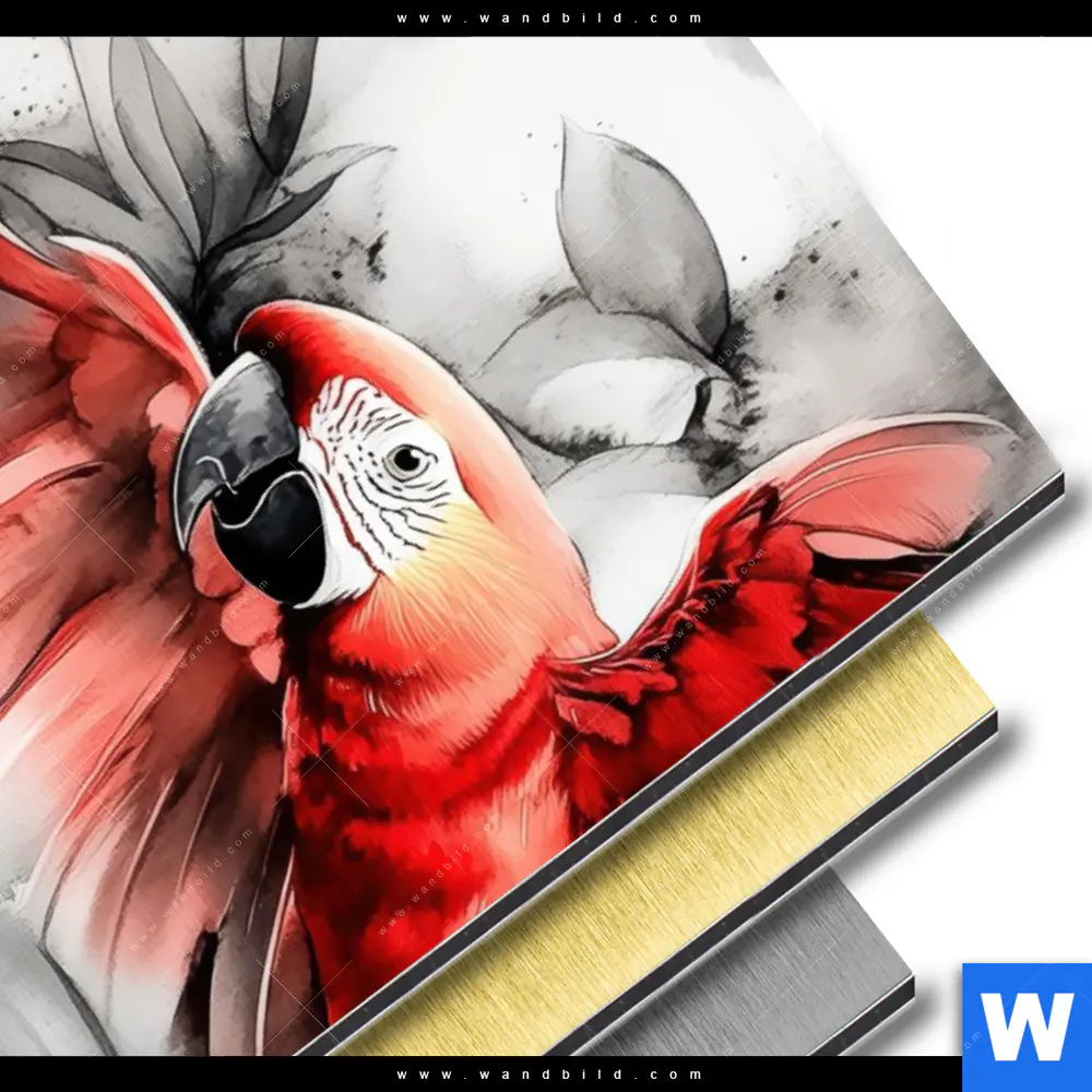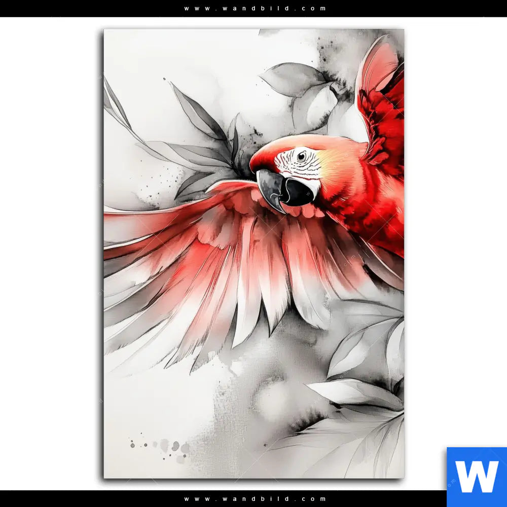 Aluminiumbild gebürstet | Roter Papagei im Flug | Hochformat
