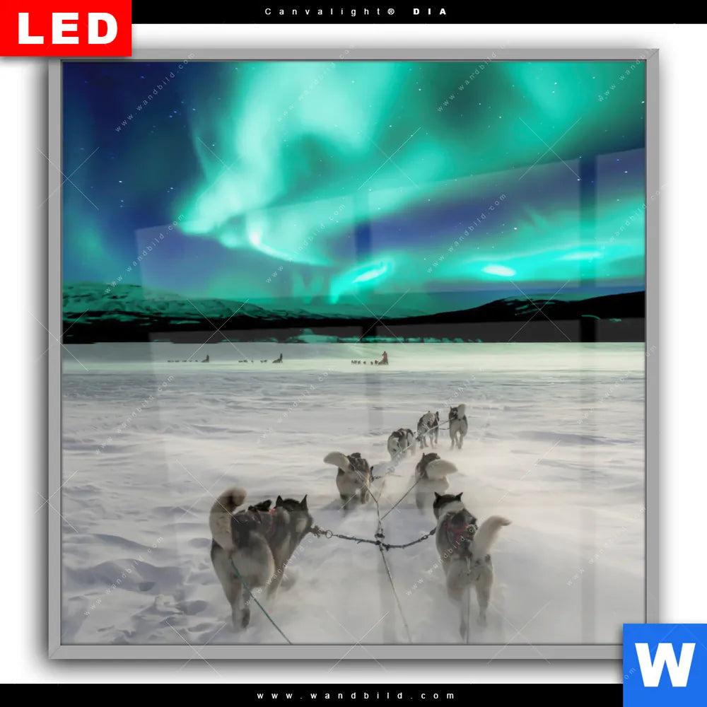 Canvalight® DIA Leuchtbild | Nordlichter und Schlittenhunde | Quadrat