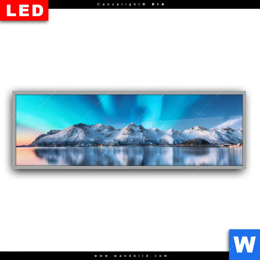 Canvalight® DIA Leuchtbild | Nordlichter und schneebedeckte Berge | Panorama
