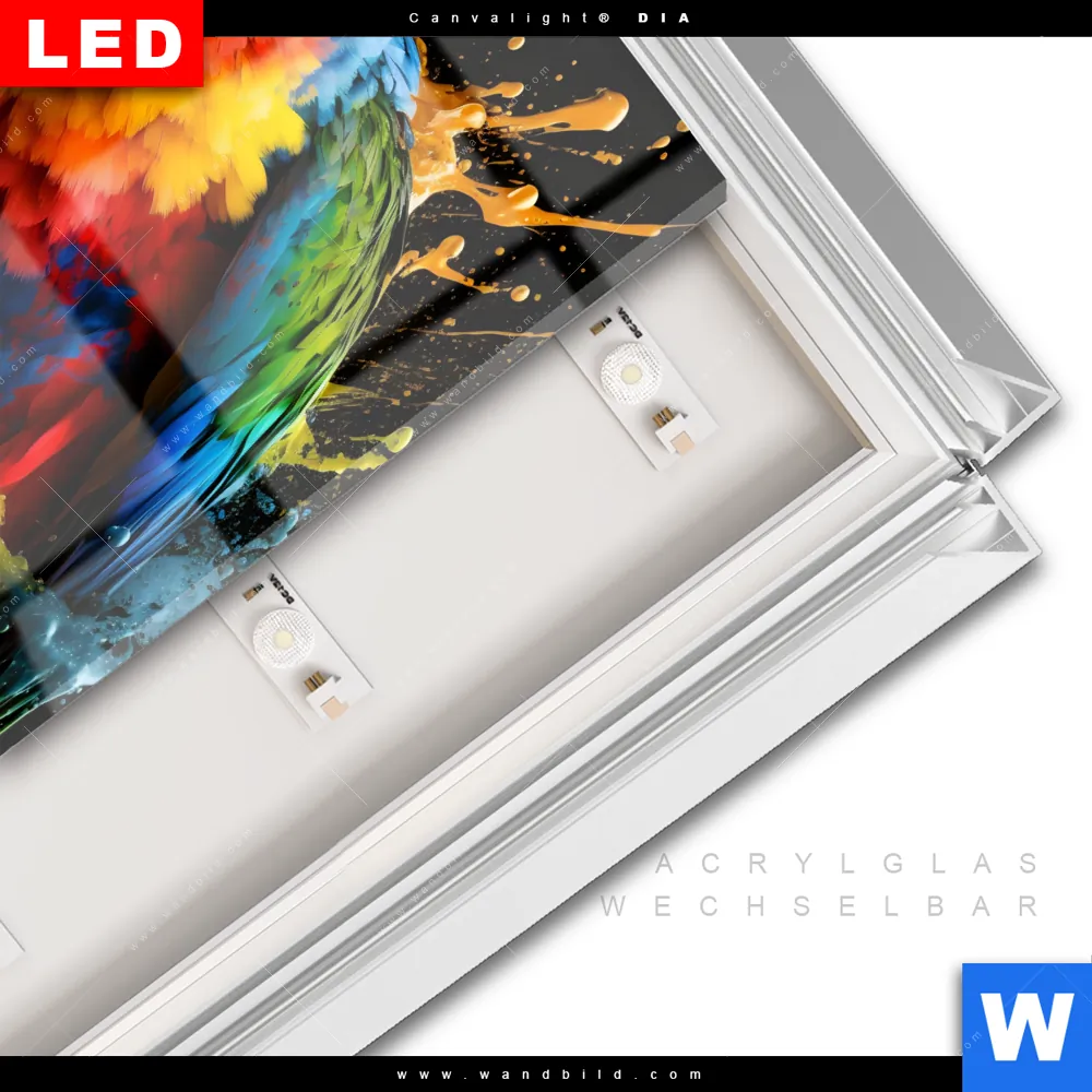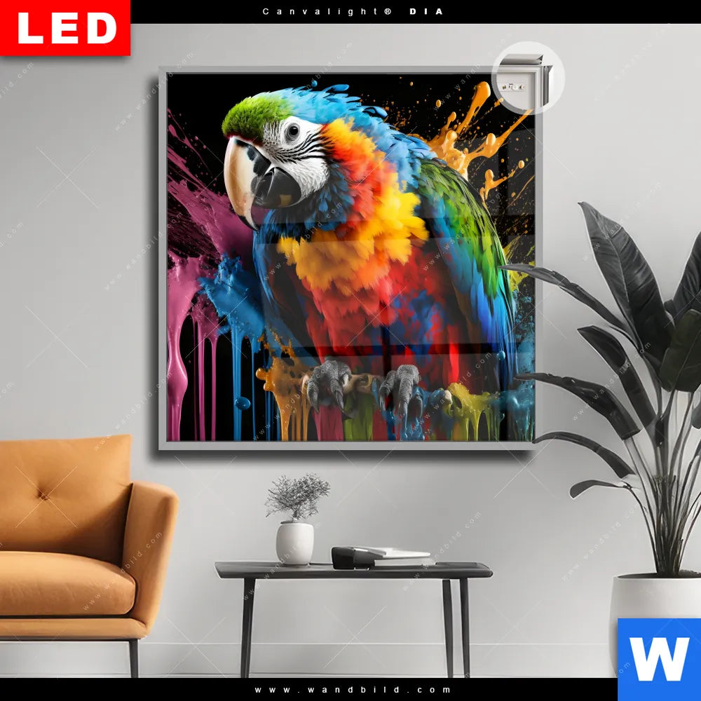 Canvalight® DIA Leuchtbild | Papagei mit bunten Farbspritzern | Quadrat