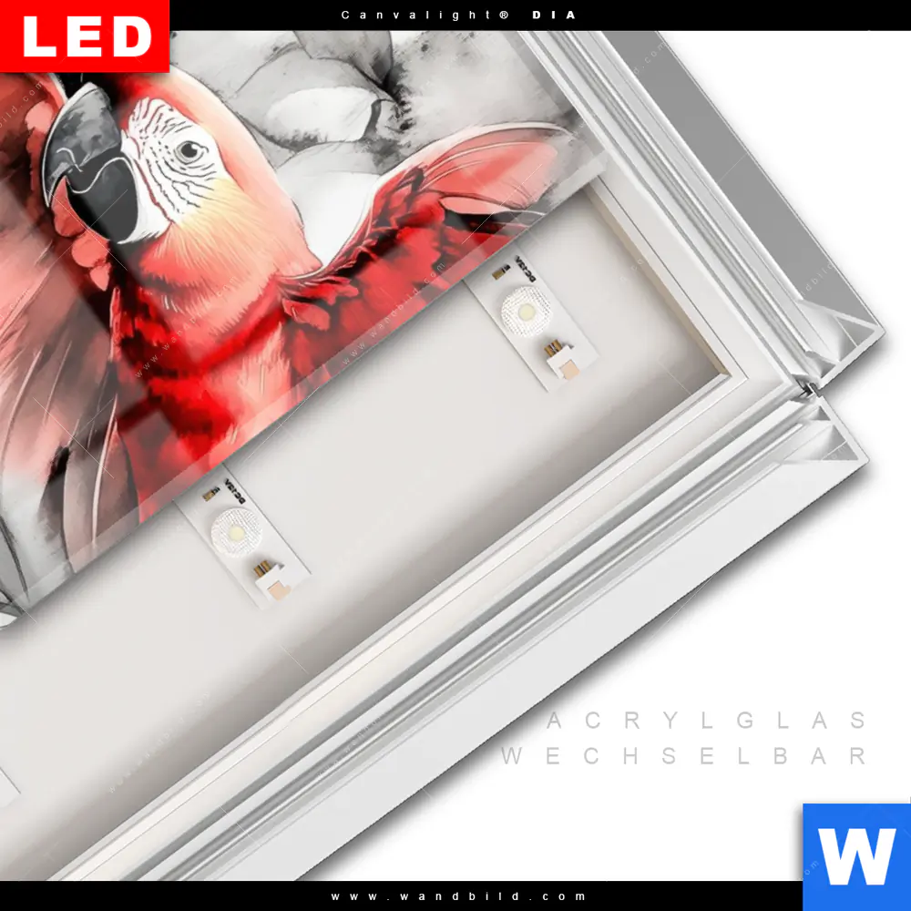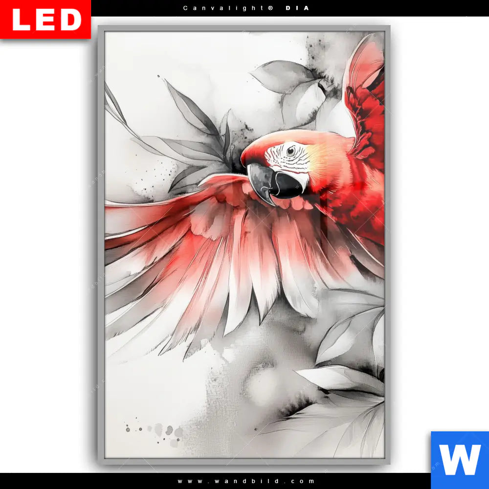 Canvalight® DIA Leuchtbild | Roter Papagei im Flug | Hochformat