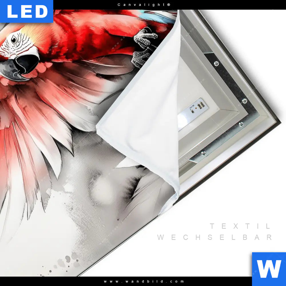 Canvalight® TEX Leuchtbild | Roter Papagei im Flug | Quadrat