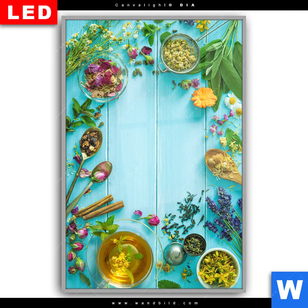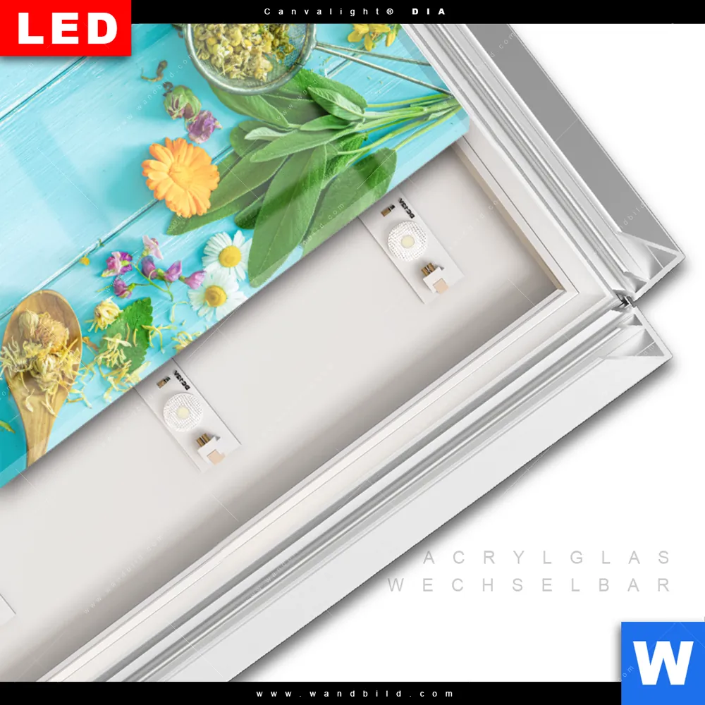Canvalight® DIA Leuchtbild | Kräuter auf blauem Holztisch | Hochformat