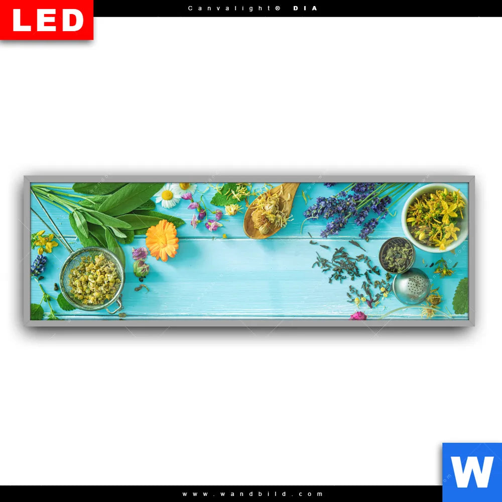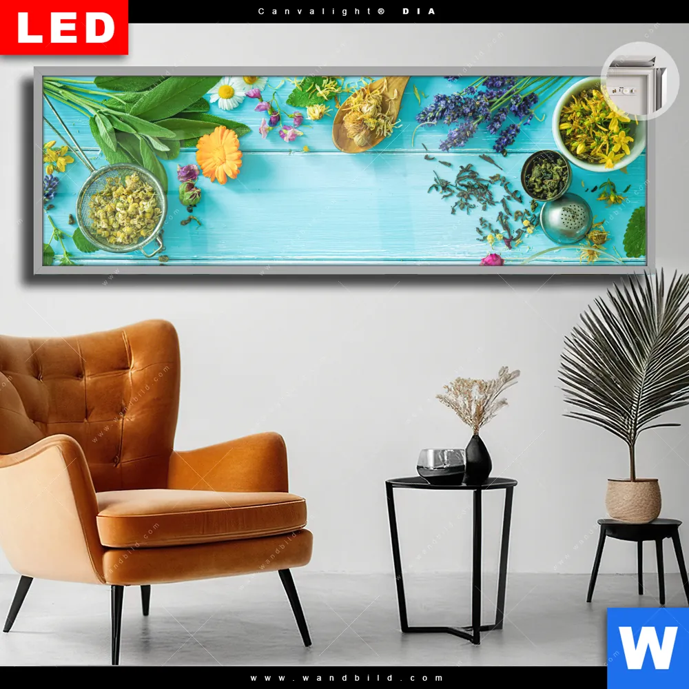 Canvalight® DIA Leuchtbild | Kräuter auf blauem Holztisch | Panorama