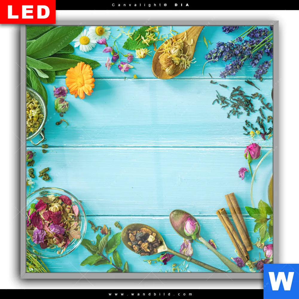 Canvalight® DIA Leuchtbild | Kräuter auf blauem Holztisch | Quadrat