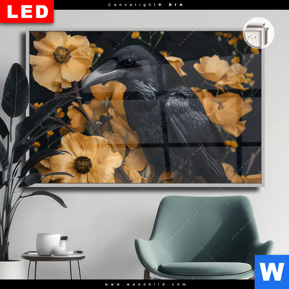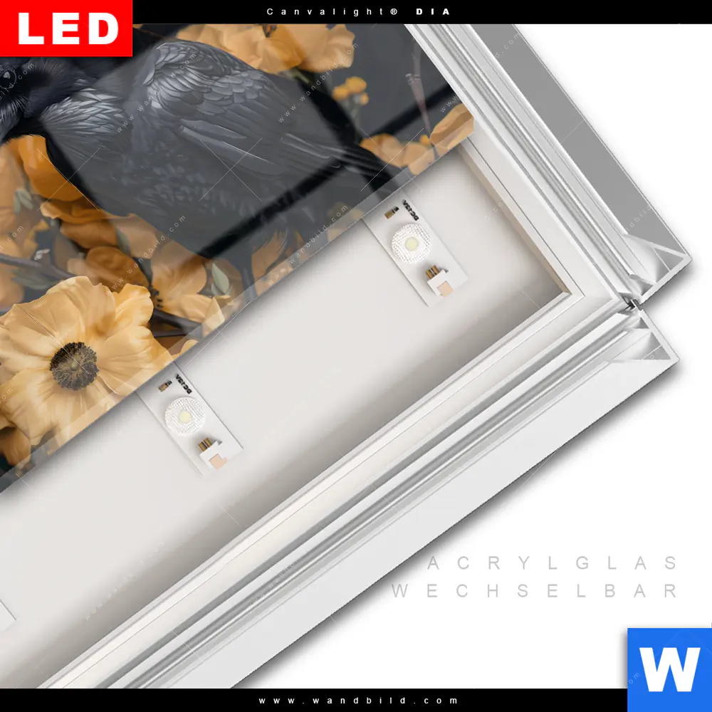Canvalight® DIA Leuchtbild | Naturbild - Rabe & Blüten | Querformat