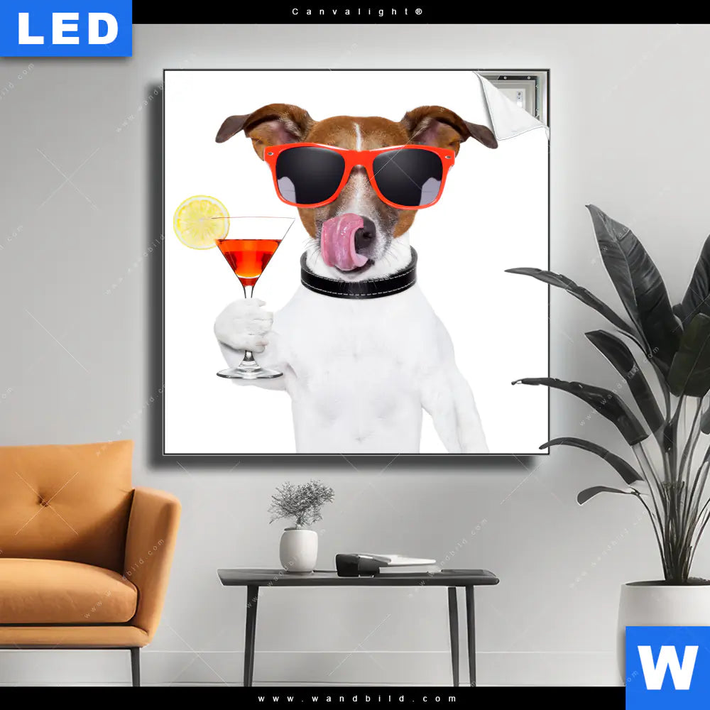 Canvalight® Leuchtbild | Lustiger Hund mit Drink | Quadrat