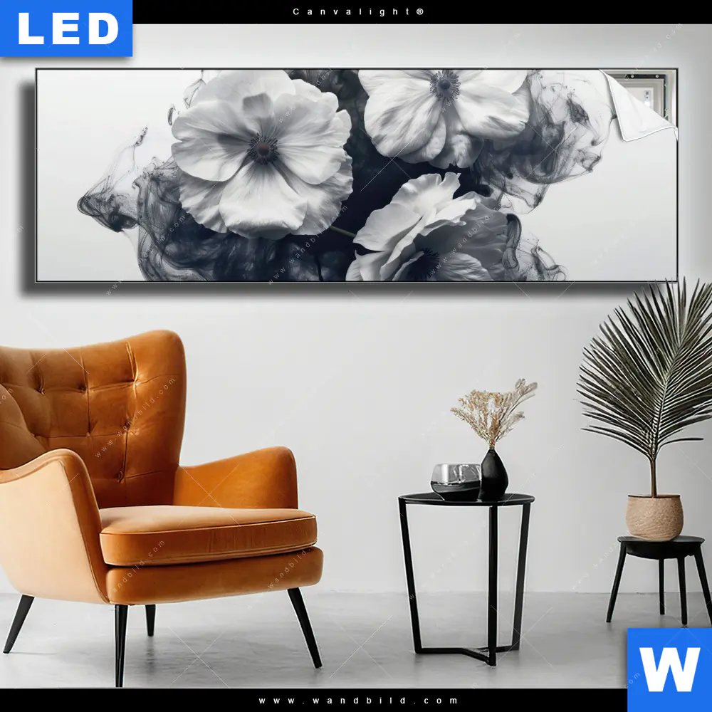 Canvalight® TEX Leuchtbild | Blumen im schwarzen Farbnebel | Panorama