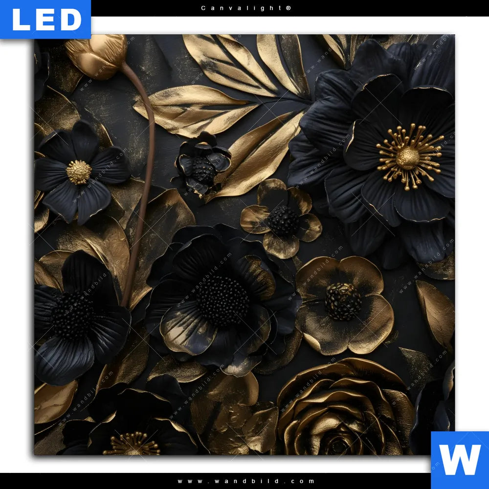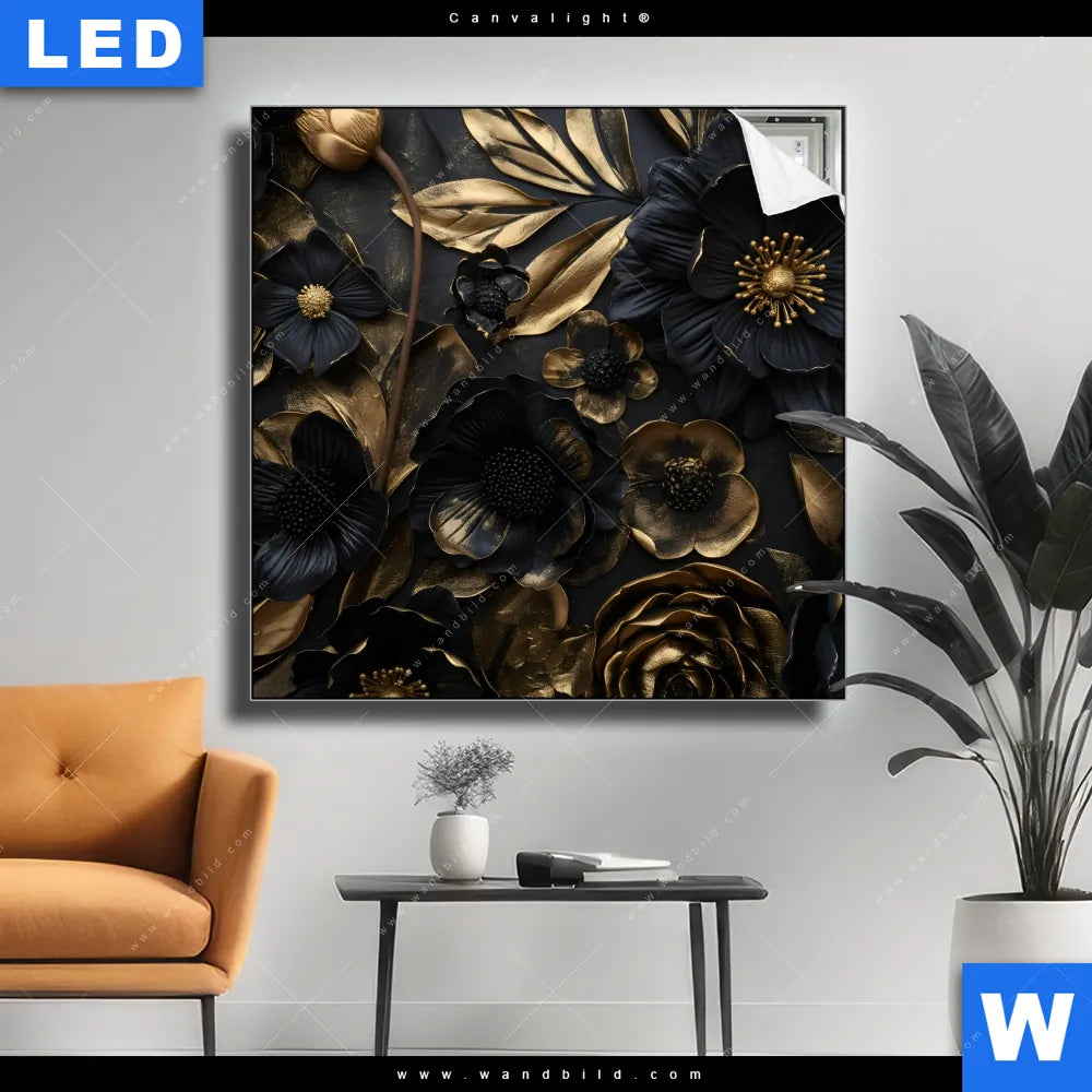 Canvalight® Leuchtbild | Schwarze und goldene Blüten | Quadrat