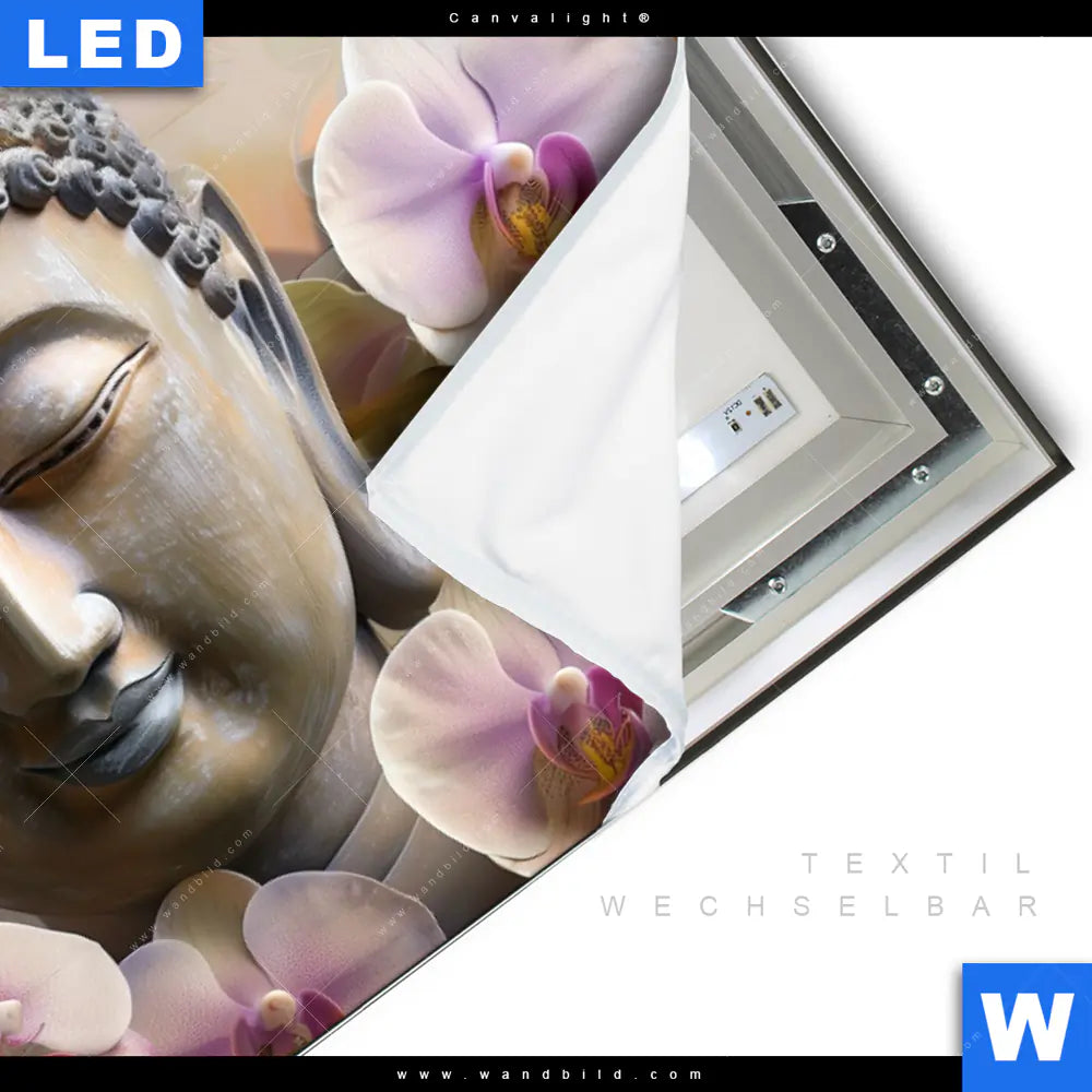 LED-Textilrahmen-Bild mit austauschbarem Buddha - Feng Shui, Blumen - Botanik Textil-Druck (Wechselbild)