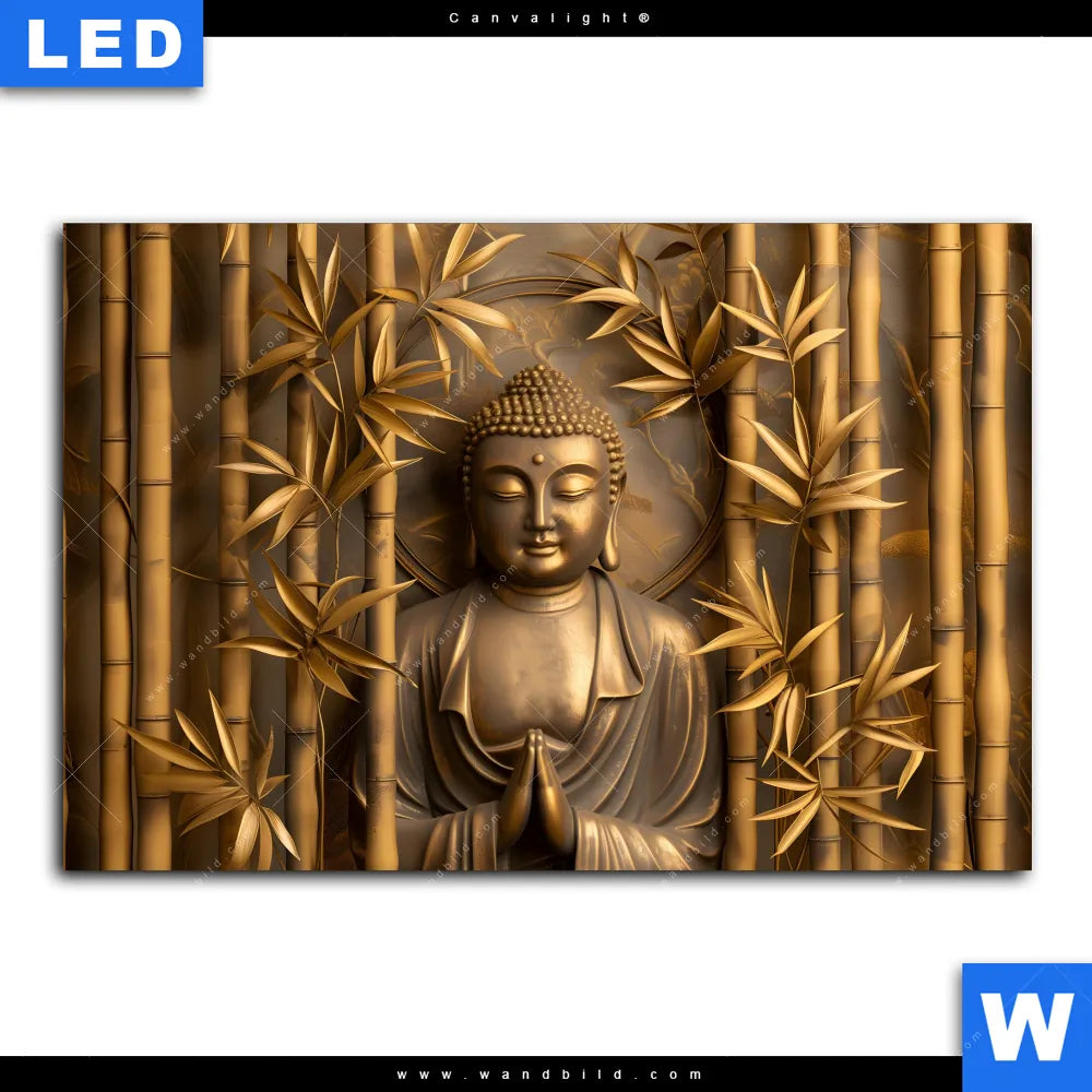 Canvalight® Leuchtbild | Goldener Buddha im Bambuswald | Querformat