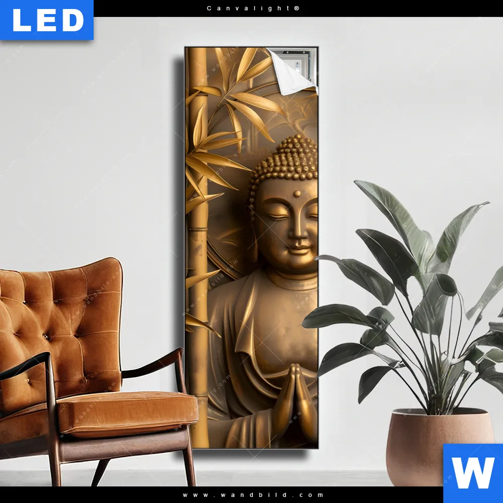 Canvalight® TEX Leuchtbild | Goldener Buddha im Bambuswald | Schmal