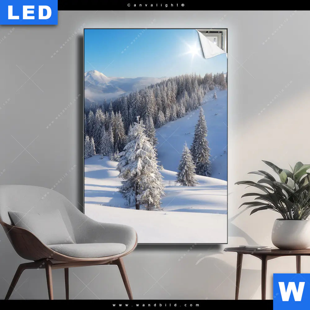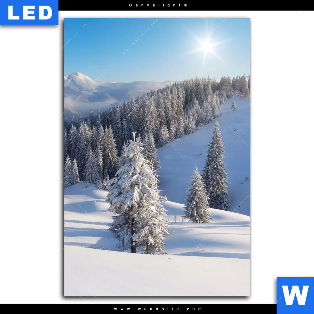 Canvalight® Leuchtbild | Berge und Wälder in Schnee | Hochformat