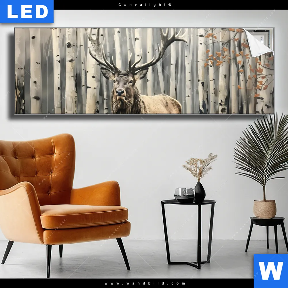 Canvalight® TEX Leuchtbild | Hirsch im Birkenwald | Panorama