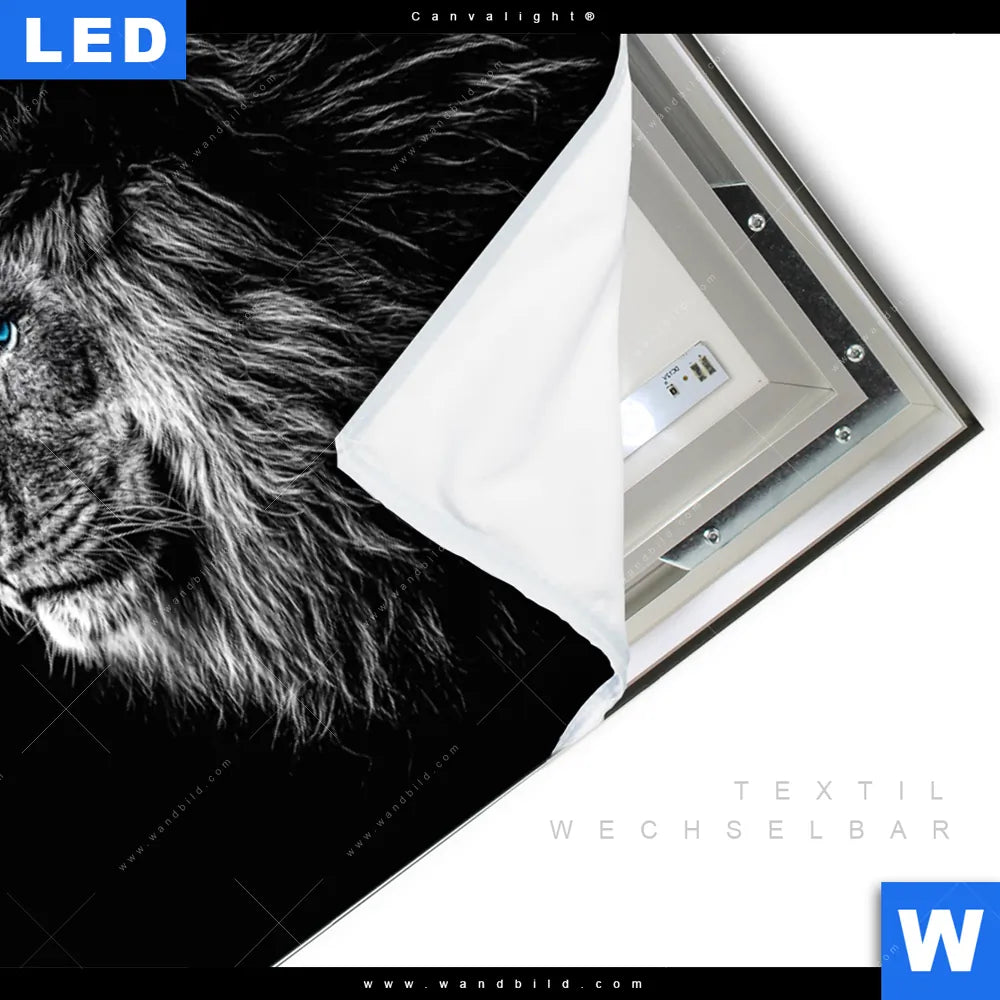 Canvalight® TEX Leuchtbild | Löwe mit blauen Augen | Querformat